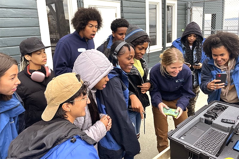 Photo: Aquarium Research Technician Megan Williams giving an ROV demonstration to youth participants in Aquabilities, a joint program by Sea Potential LLC and Youth Maritime Collaborative.
