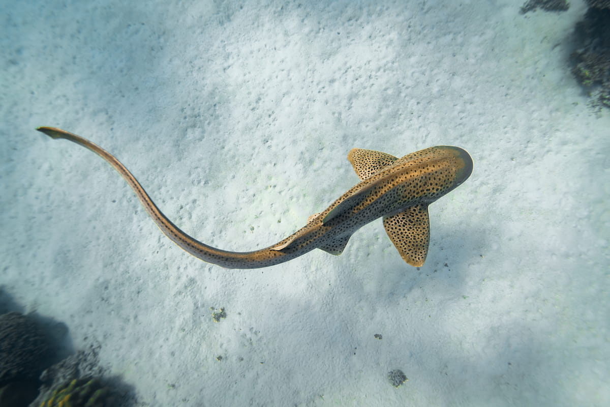 Indo-Pacific leopard sharks (Stegostoma tigrinum) are also called zebra sharks, hiu belimbing and other names. Once abundant in the Coral Triangle, these sharks are now nearly extinct due to overfishing and habitat loss. Like all sharks, they help maintain a healthy food web and are essential to the well-being of their entire ecosystem.