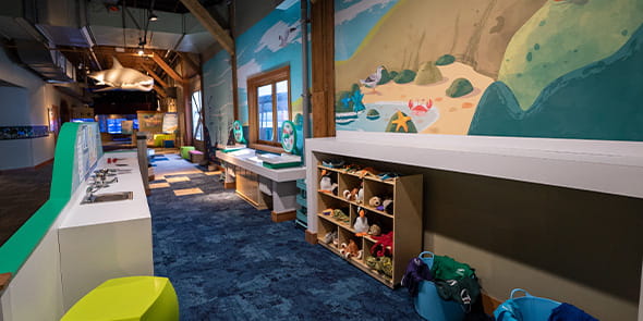 The play space also features an artificial tide pool area for kids to practice looking closely, touching gently and exploring carefully—just as we encourage them to do in our Life on the Edge habitat. Colorful, tactile, filled with faux sea creatures and just 14 inches high, this area is ideal for our youngest guests, who aren’t quite tall enough (or ready) to explore our touch pools.