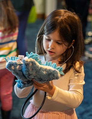 Start in the costume/animal area to dress up as an Aquarium veterinarian, biologist, aquarist or interpreter, and choose a plush animal to borrow. Then head to the exam station to give the animal a checkup, or the feeding and enrichment station to prepare a pretend meal or design an activity. A holding habitat offers space for animals to rest, play, eat or interact.