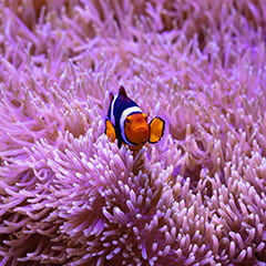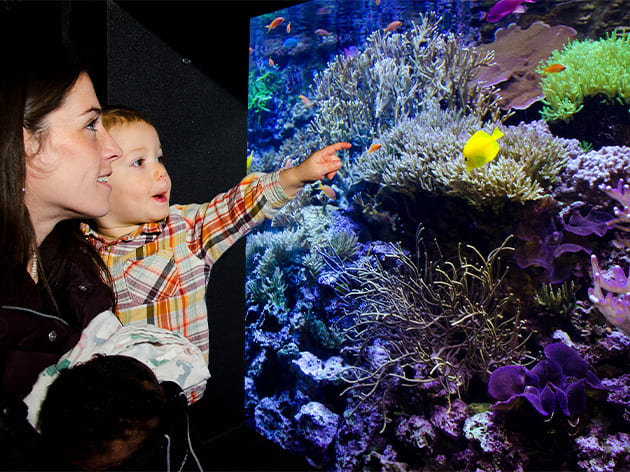 Discover the vibrant array of life on a coral reef in the Pacific Ocean. Our 25,000-gallon habitat demonstrates the structure of the reef fish community, one of the most complex on Earth. Watch in wonder as a beautiful variety of warm-water fish—puffers, tangs, wrasses, triggerfish and more—swim through our large, human-made coral reef. You may even see Aquarium divers entering the habitat to feed the fish!