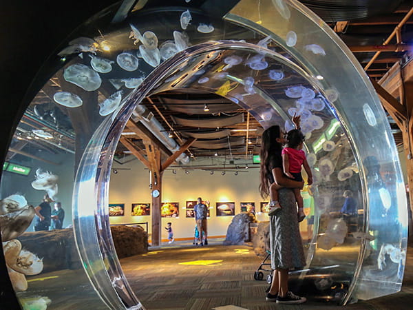 You can literally step through this habitat—it’s a beautifully lit, ever-changing, 12-foot high acrylic ring filled with luminous moon jellies. Watch in wonder as they gently drift through the water, floating up, down and around the ring, and learn about their fascinating life cycle via the adjacent signage. (This is also one of the Aquarium’s most popular selfie spots!)